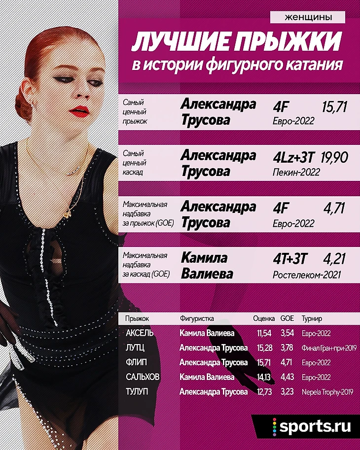 • Пока девушки не научились прыгать четверной аксель, самым дорогим одиночным прыжком в истории считается четверной флип – его сделала Александра Трусова на предолимпийском Евро-2022 в Талинне. Он же остается рекордным по надбавке за качество исполнения (GOE) – 4,71 балла от судей.