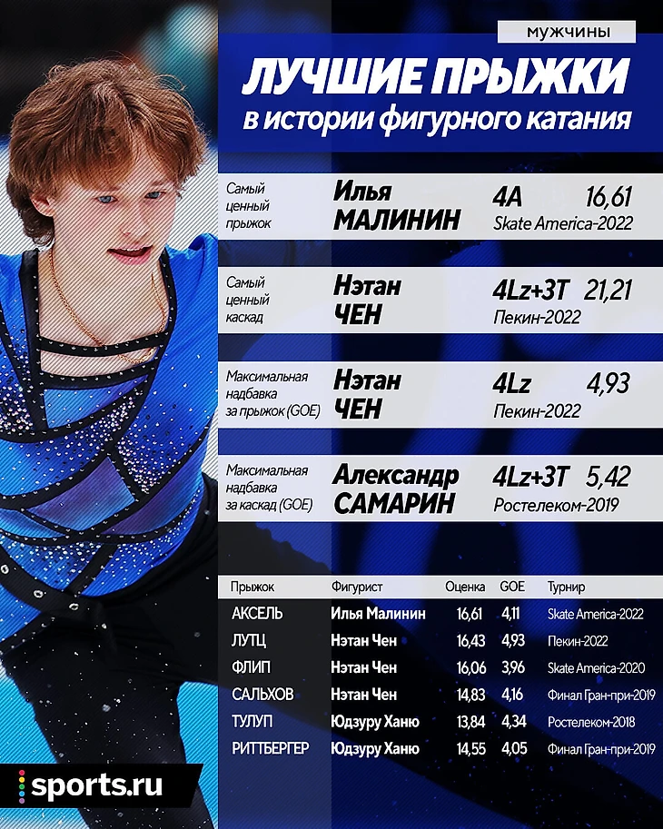 • До Малинина автором самого ценного прыжка был, конечно, Нэтан Чен – в произвольной на Играх-2022 в Пекине американец исполнил четверной лутц на 16,43 балла и максимальную в истории фигурки надбавку за прыжок вне каскада в 4,93 балла. До него рекорд долго держал китаец Боян Цзинь – его четверной лутц на Чемпионате четырех континентов-2018 оценили в 16,31 балла – правда, тогда базовая стоимость этого прыжка была выше на 2,1 балла.