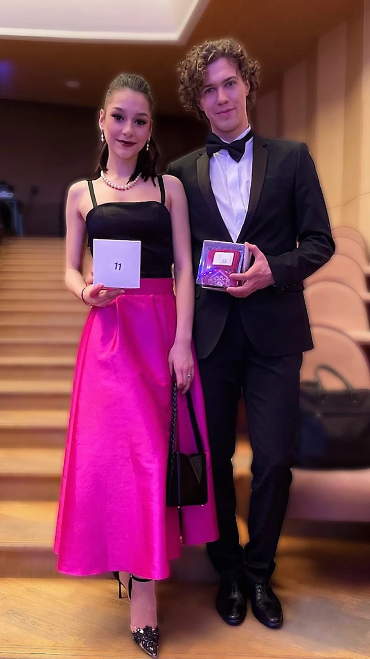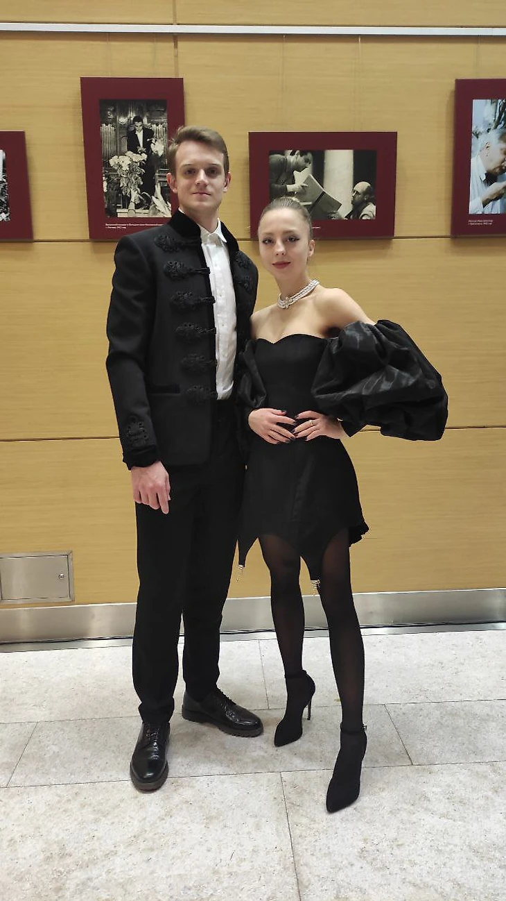 Андрей Мозалев и Ксения Гущина не отстают – тоже в монохромных нарядах.