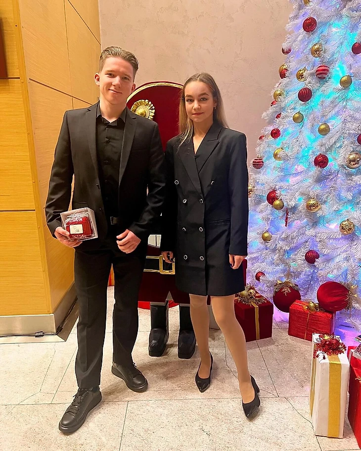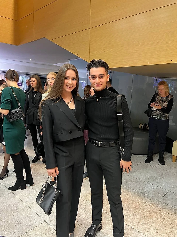 Главный цвет вечера – черный. Валиева и Даниелян выбрали тотал-блэк. Камила надела брючный костюм с укороченным жакетом, Артур – чуть более неформальный вариант – брюки и водолазку.