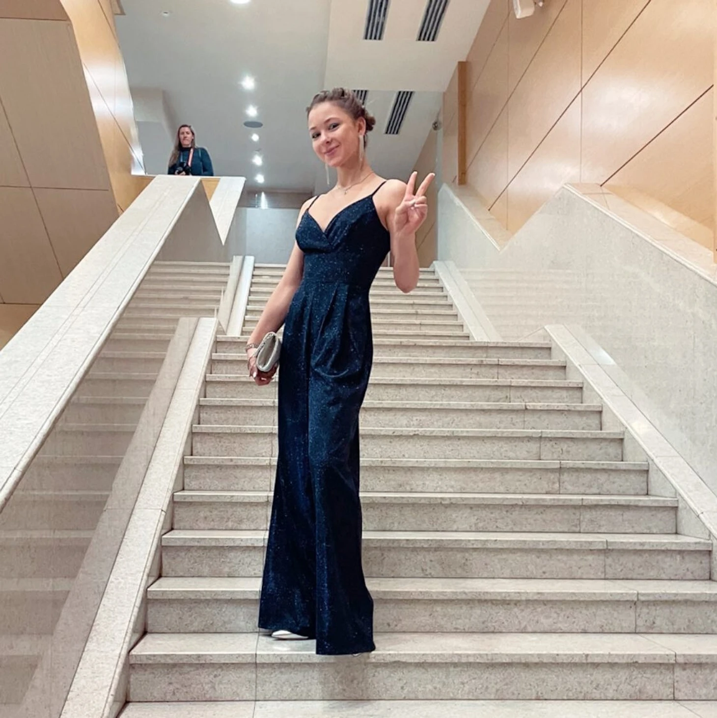 Софья Самоделкина в блестящем комбинезоне темно-синего цвета. Празднично!