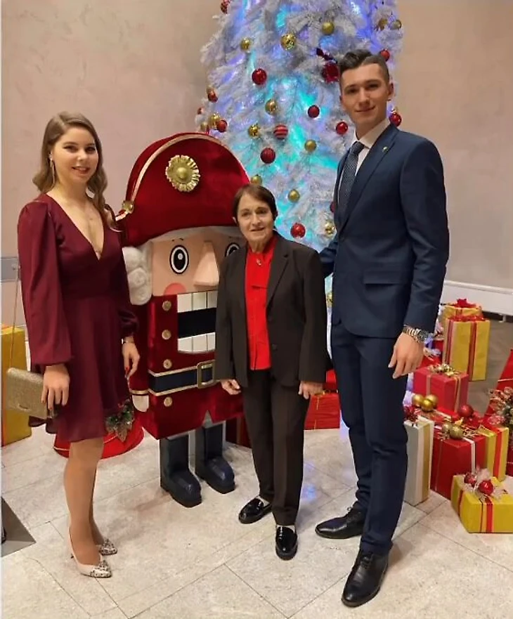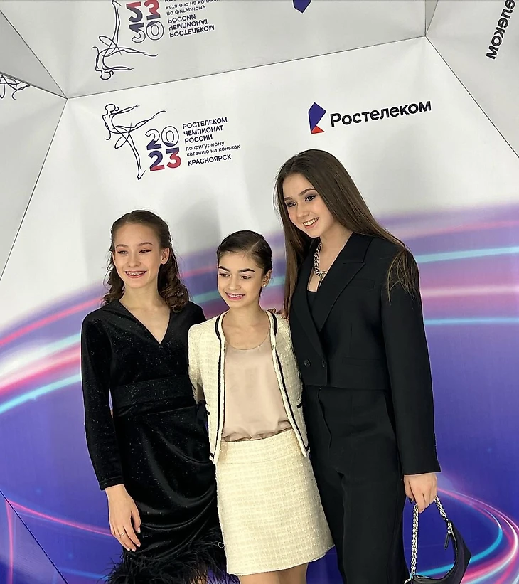 Трио Тутберидзе в сборе: Софья Акатьева – в бархатном платье с перьями, Аделия Петросян – в костюме цвета слоновой кости с юбкой.