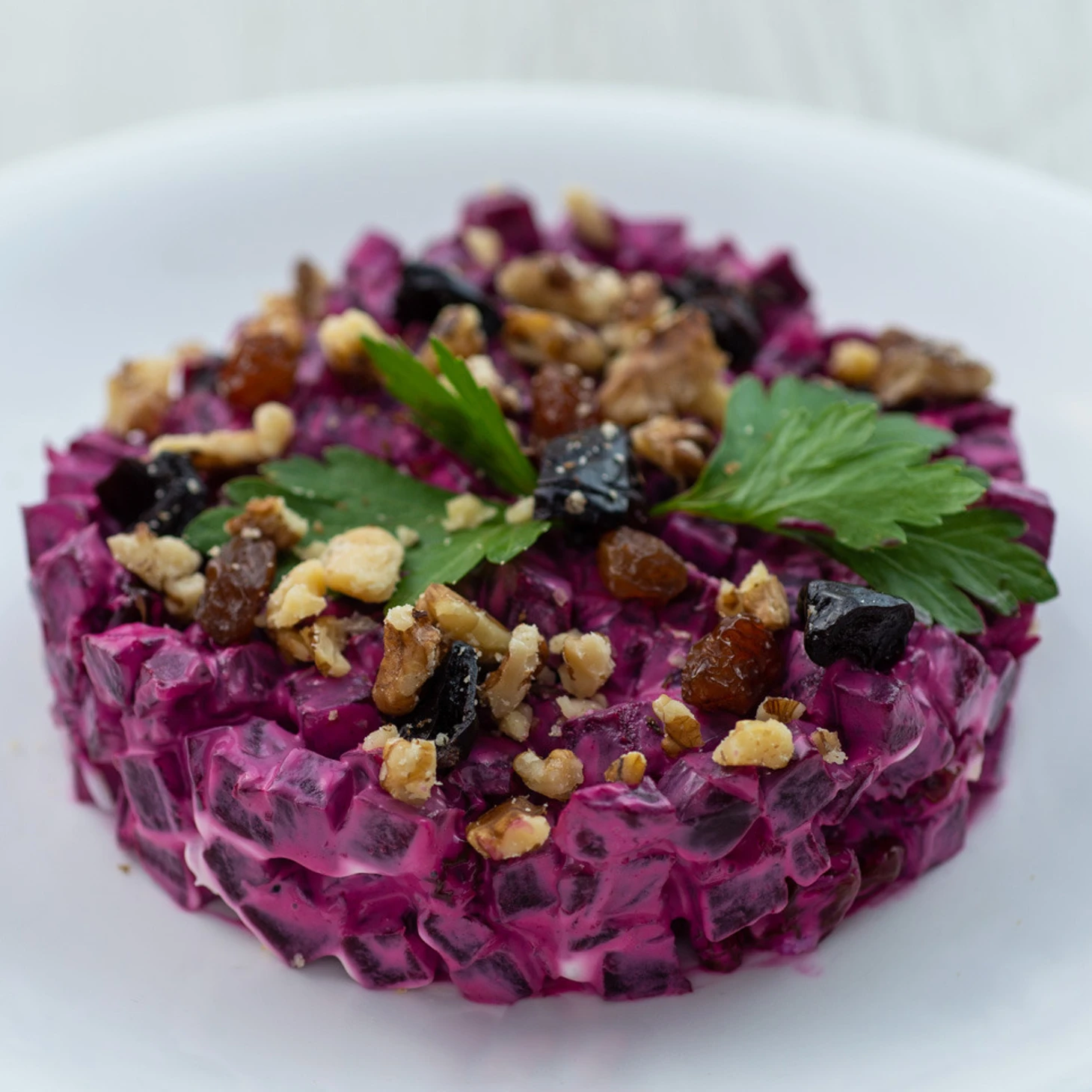4. Салат завершающий. (Свёкла отварная, чернослив, грецкий орех, чеснок, майонез).