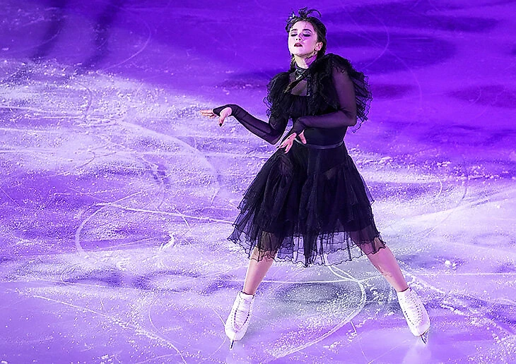 Камила настолько вжилась в образ, что оставалась в нем до выхода со льда. Во время выступления грозно смотрела в зал, а в один момент счистила ледовую крошку с конька – и кинула в зрителей.