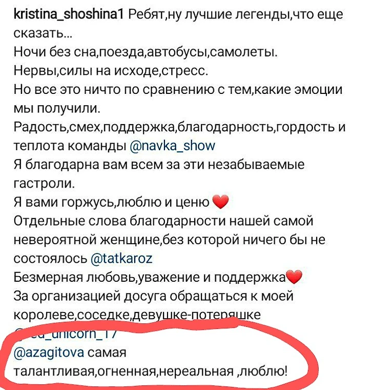 Подруга Алины, фигуриста Кристина Сошина, тоже принимавшая участие в шоу «Спящая красавица» в Дубае, также, как и Алина, не уехала. И выложила трогательный пост про окончание гастролей. Кстати, она тоже, как и я, пишет, что Алина «огненная»!😉