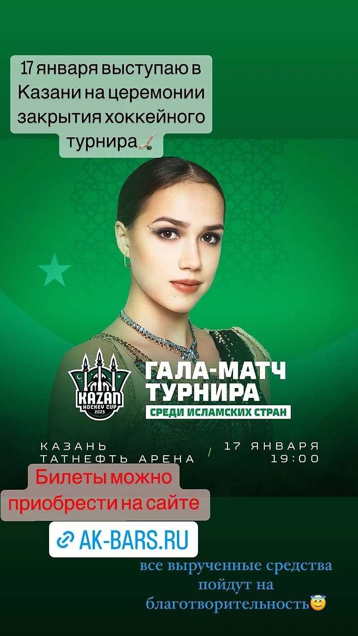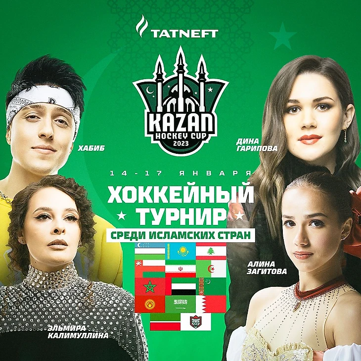Алина Загитова, Дина Гарипова и Хабиб выступят на турнире среди исламских стран в Казани С 14 по 17 января в Казани пройдёт первый турнир по хоккею среди команд исламских стран, на котором сыграют хоккеисты из ОАЭ, Саудовской Аравии, Ирана, Омана, Бахрейна, Казахстана, Туркменистана, Узбекистана, Кыргызстана, Алжира, Марокко и Ливана. Татарстан представят команда системы «Ак Барса» и хоккейная команда Духовного управления мусульман РТ. Открытие турнира пройдёт 14 января во Дворце спорта в 13:00. Перед игрой выступят Эльмира Калимуллина и Марат Яруллин. 17 января в 19:00 на льду «Татнефть Арены» состоится гала-матч, в котором сыграют лучшие игроки каждой команды. На закрытии турнира выступят Хабиб, Дина Гарипова и олимпийская чемпионка Алина Загитова. Вход на все матчи турнира свободный. Подробности 👉 ak-bars.ru/news/23086