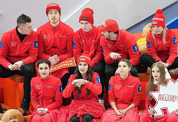 Вторую команду под названием «Красная машина» уже второй раз возглавила Алина Загитова.Чемпионки явно готовились даже имиджево: Алина просидела весь вечер в красной шапке, а Камила выбрала ярко-голубые тени. Евгения Медведева (раньше она тоже капитанила) теперь вела в паре с Хрусталевым.