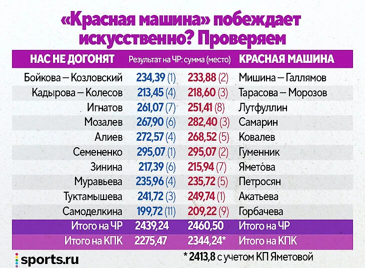 Куда нагляднее расклады по суммам баллов, которые набраны на чемпионате России. Перевес действительно в пользу «Красной машины»: 2460,50 против 2439,24 (и это без учета того, что у проигравших вместо планировавшейся Зининой в произвольной выступала запасная Гущина).