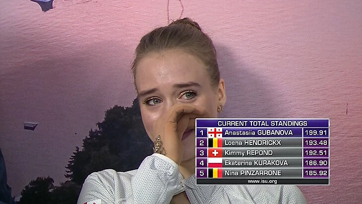 Как итог – лишь 125,63 за произвольную и 193,48 по сумме (это худший результат бельгийки за три последних сезона). Всего 0,97 баллов разделили ее с Репонд. Во многом помогли компоненты, они у Хендрикс лучшие, а вот оценка за технику – только 7-я. Слезы в кисс энд край – точно не от радости. И ведь на тот момент Луна вышла в лидеры.