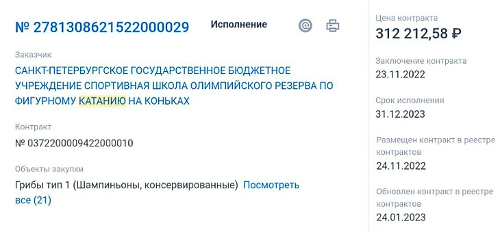 В телеграмм-каналах активно обсуждают забавную информацию о том, что СПГБУ СШОР по фигурному катанию потратит 312 000 рублей на закупку грибов, а если точнее - консервированных шампиньонов.