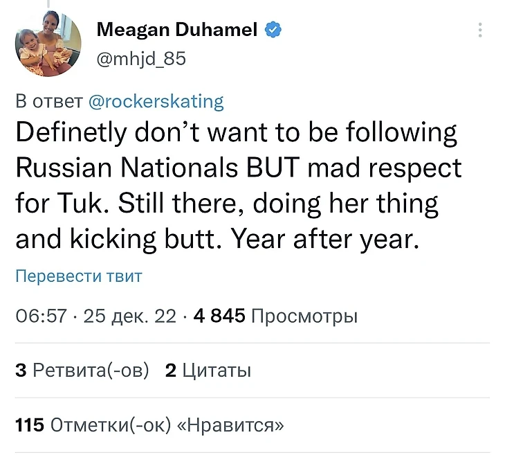 В парном катании без наших совсем кисло, и Меган это прекрасно понимает. И как раз к парникам нашим у неё отношение, в целом, хорошее. То есть, если надо, Дюамель вполне способна высказываться без набросов и негатива, но случается такое по большим праздникам.