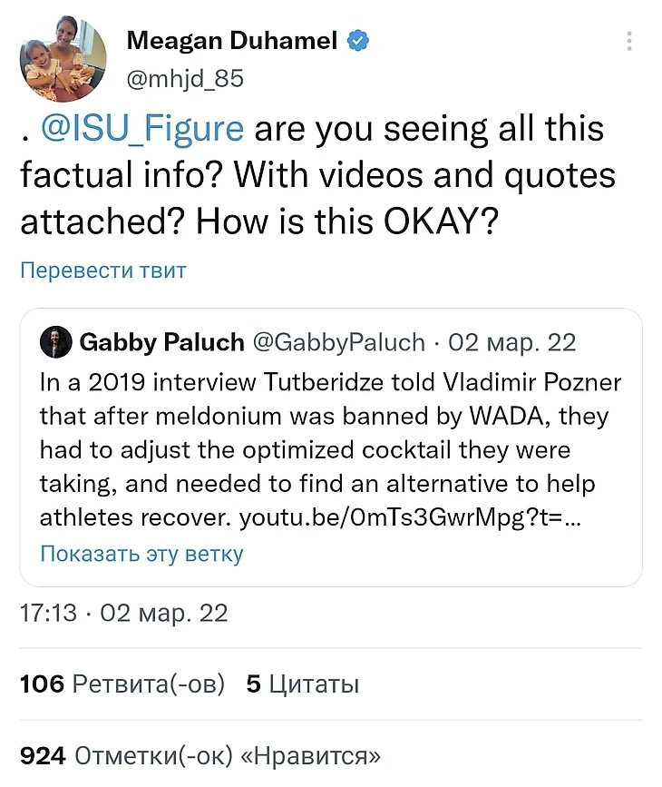 Теперь Меган находит намеки на использование допинга даже в старых репликах Тутберидзе. Конечно, канадке вспомнилось интервью Этери Владимиру Познеру в 2019-м – там тренер коснулась новых «способов восстановления» после запрета мельдония.
