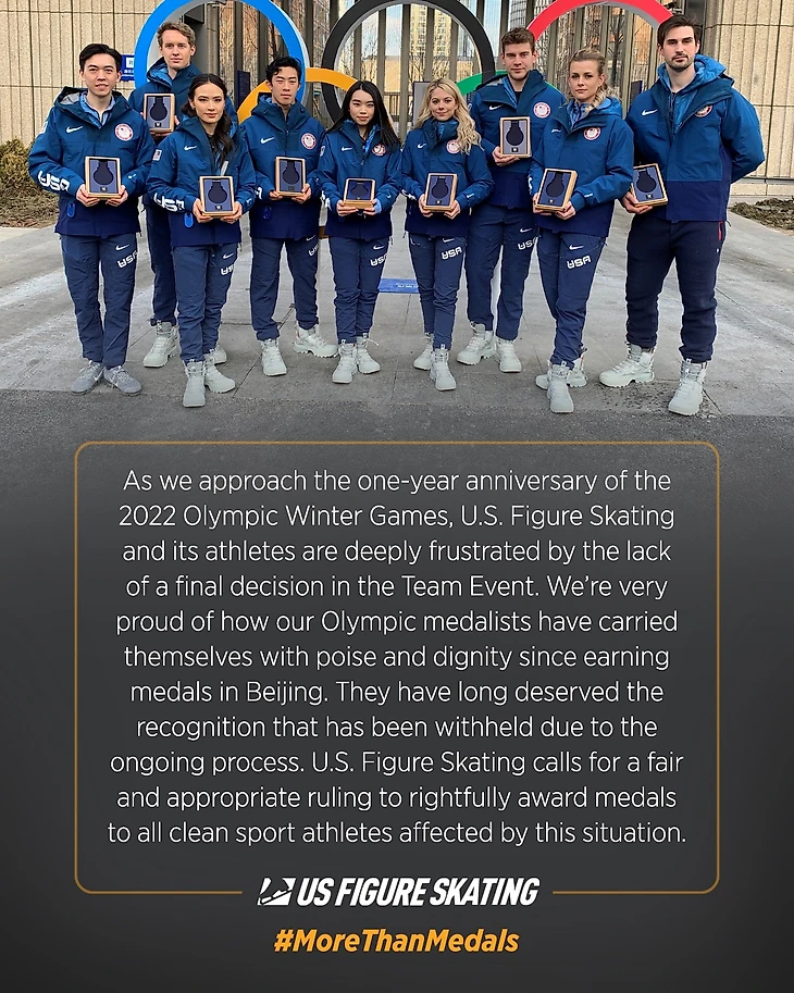 «Федерация фигурного катания США и спортсмены глубоко разочарованы отсутствием окончательного решения в командном зачете к моменту приближения годовщины Зимних Олимпийских игр 2022 года. Мы очень гордимся тем, как наши олимпийские медалисты вели себя уверенно и достойно с тех пор, как завоевали медали в Пекине. Они давно заслужили признание, которое не получили из-за продолжающегося процесса. Федерация фигурного катания США призывает к справедливому и надлежащему решению, чтобы по праву присудить медали всем чистым спортсменам, пострадавшим от этой ситуации».