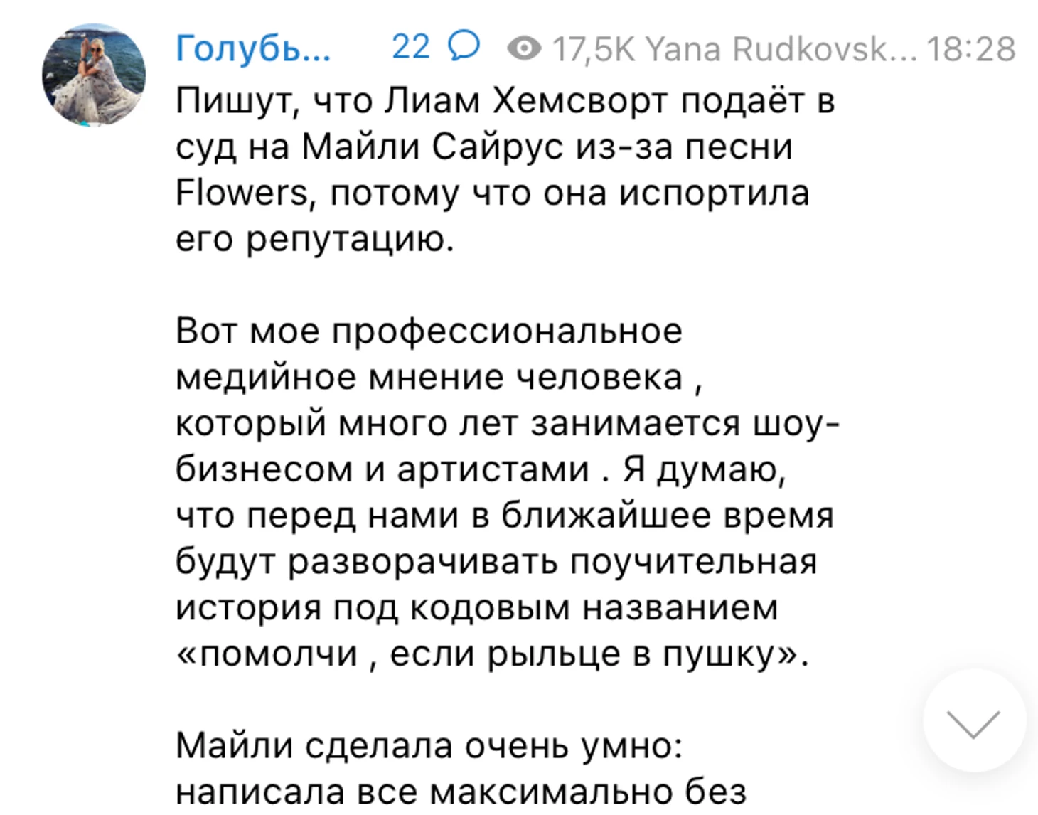 «Пишут, что Лиам Хемсворт подаёт в суд на Майли Сайрус из-за песни Flowers, потому что она испортила его репутацию.