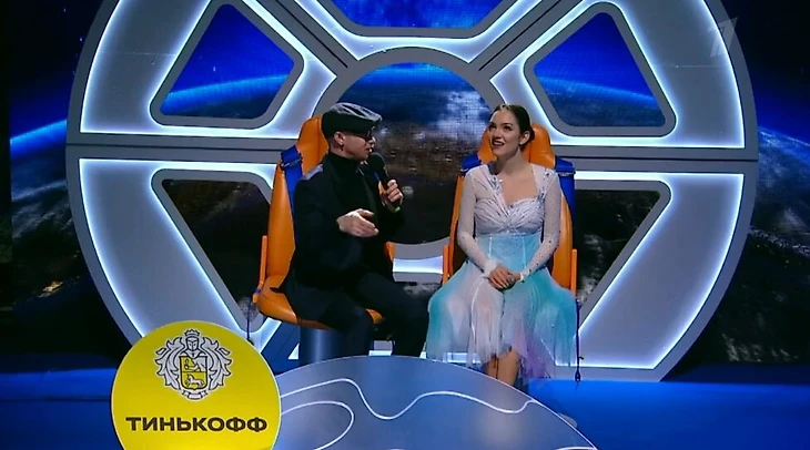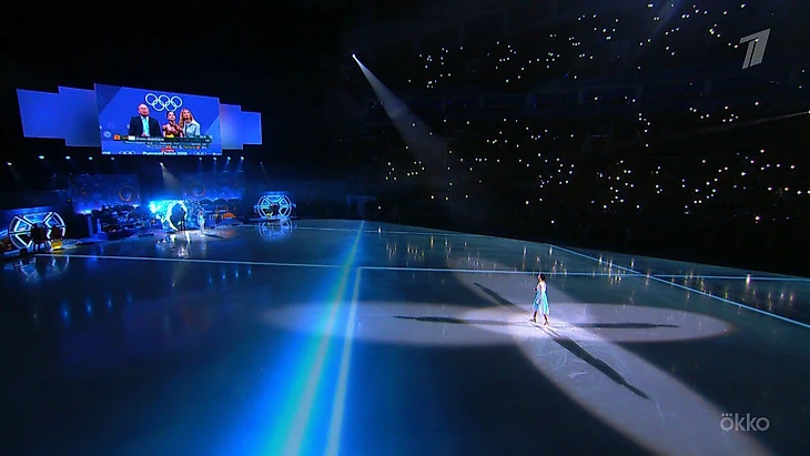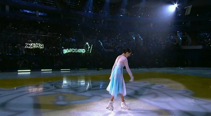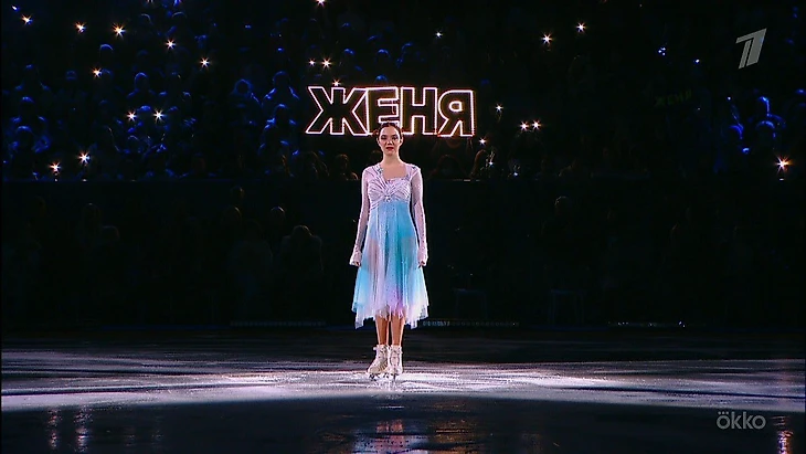 Номер Жени начался с фрагмента ее произвольной программы на Олимпиаде-2018 в Пхенчхане – на экране показали ее оценки и эмоции Татьяны Тарасовой и Александра Гришина в прямом эфире.