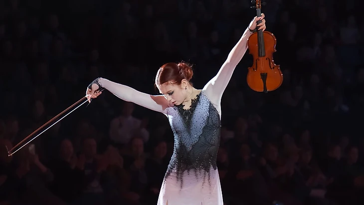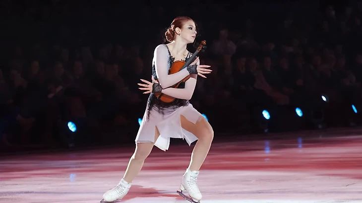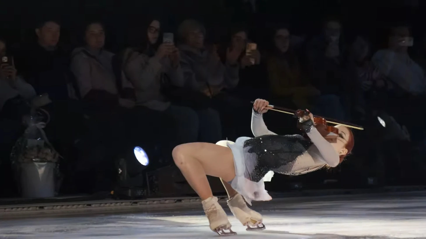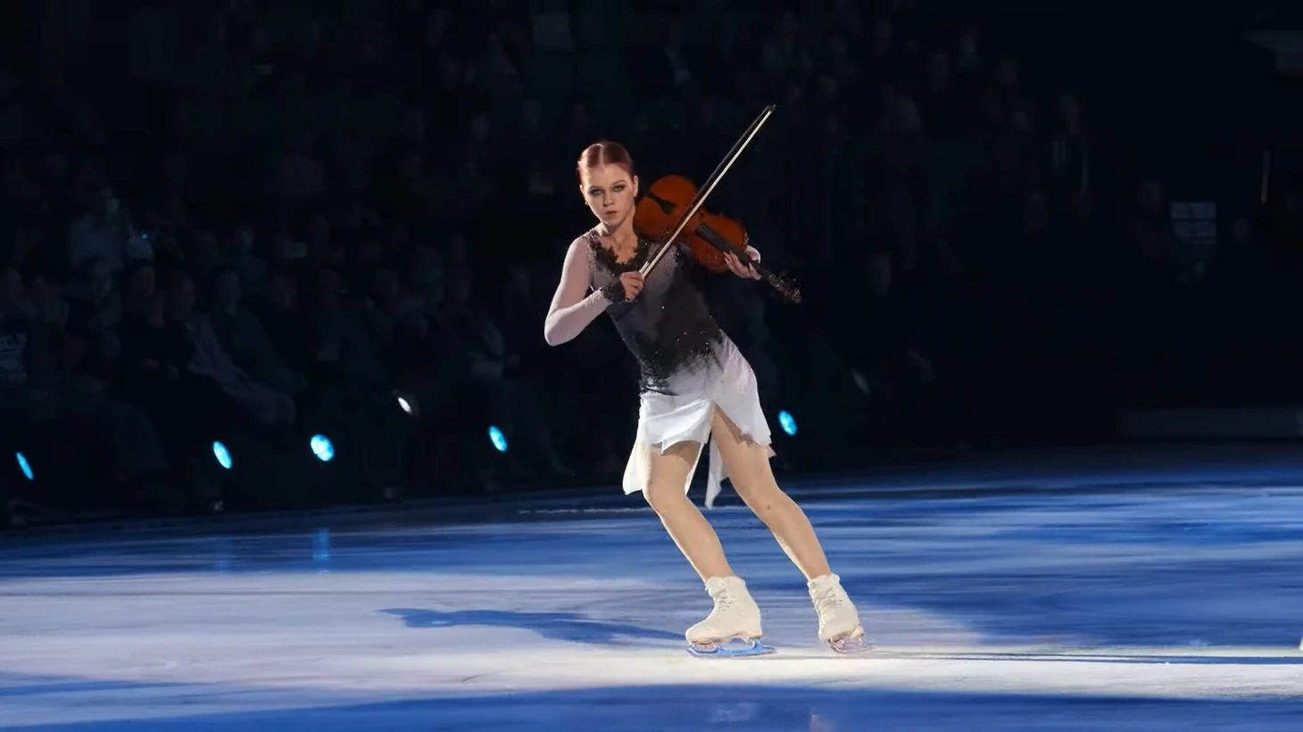 Трусова начинает выступление без реквизита, но после каскада из тройных прыжков берет смычок. С ним она даже исполняет двойной аксель.