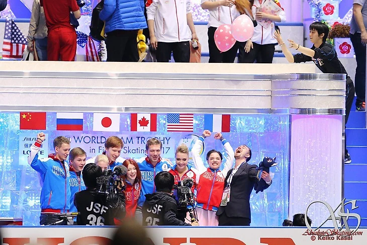 Тот командный чемпионат мира запомнился еще и из-за чрезвычайно теплой атмосферы, царившей как в КиКе россиян, так и у команд-соперниц. На гала-шоу Евгения исполнила полную версию своего номера Sailor Moon, после чего весело дурачилась в компании Шомы Уно и Юзуру Ханю. Это был настоящий праздник, который не только оставил множество теплых воспоминаний, но и подаривший огромное количество мемных фото и видео.