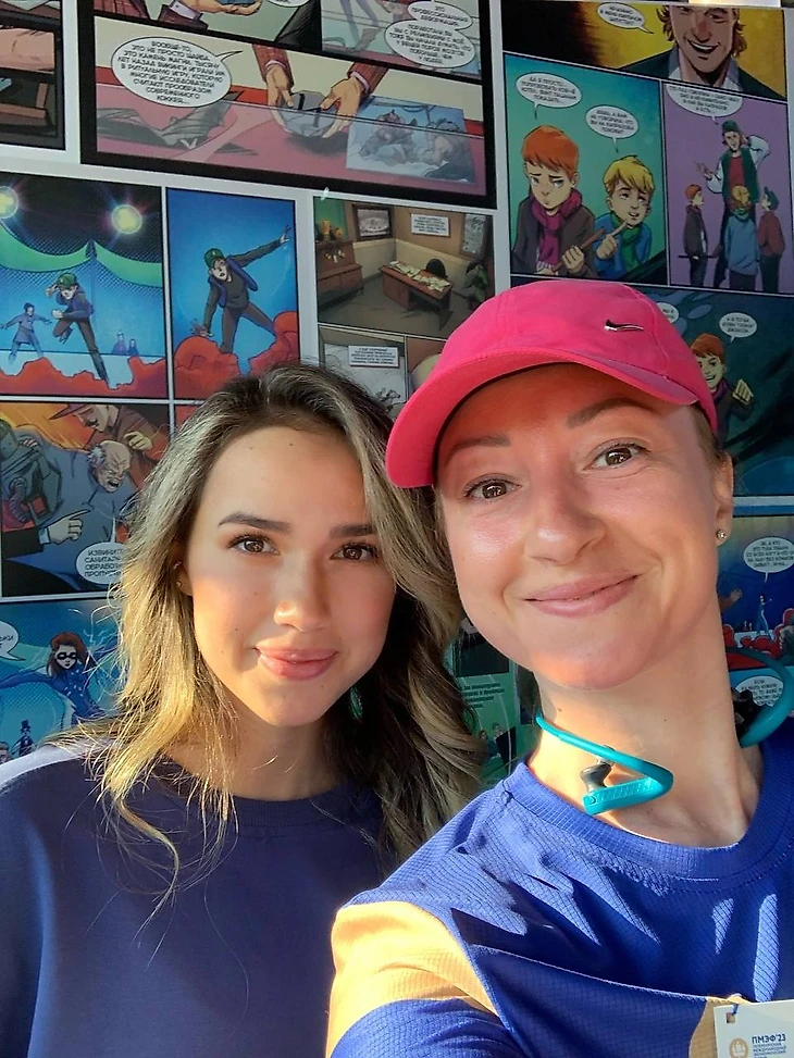 Несмотря на раннее начало, в 6 часов утра, разминка прошла активно, с большим количеством участников. Алина и Артур прекрасно взаимодействовали с публикой и друг другом. А потом была фото и автограф-сессия для всех желающих. Итог - бодрые и довольные участники, которые радостно постили в своих соцсетях фото с Алиной, а также - заряд для Алины на весь, такой длинный и важный день.