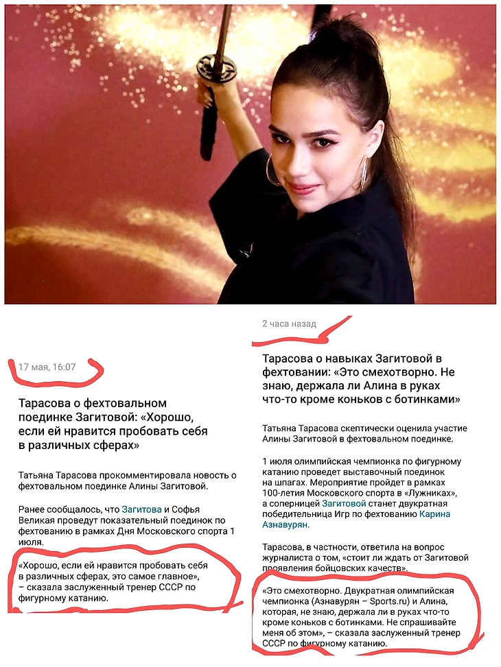 Как мы видим, обе спортсменки с удовольствием приняли решение об участии в показательном поединке впо фехтованию. Нашими выдающимися и признанными во всём мире спортсменами, в том числе и Алиной Загитовой, делается очень многое для популяризации спорта, в целом, и отдельных видов, в частности, среди молодёжи и не только, что является одним из важнейших направлений развития нашей страны, особенно сейчас, в это непростое, и для спорта в том числе, время. Однако, находятся ещё люди, как правило из, как я их называю, "бывших великих", которые то ли не понимают этого и правда, то ли придуриваются, потому что их высказывания лишены всякой логики и разума, а оскорбления в их словах и тональности, которая читается даже между строк, считаются нормой. И ведь не стыдно же им! Просто позор, иметь таких "экспертов" среди "заслуженных". Ждём остальных по списку? Вайц будет? До турнира ещё почти две недели, а обзвон уже начался. Что будет во время турнира, да и после - мы уже это проходили. Сил тебе, наша девочка, держись!