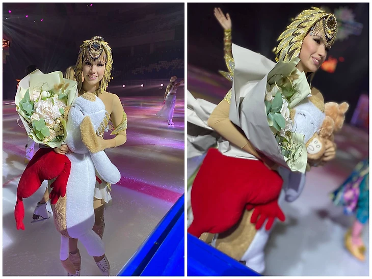А ведь это – большой труд! И, даже если не обращать внимания на элементы (это уж мы так, по-привычке), то в целом, восприятие от катания Алины как всегда – это восхищение и любовь. И аплодисменты зрителей – заслуженная награда! Как и цветы с сердечками, которыми одарили Алину её поклонники, приехавшие специально на премьеру.