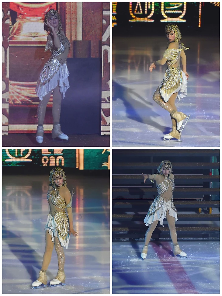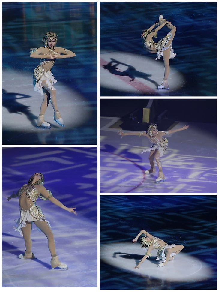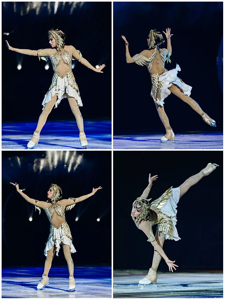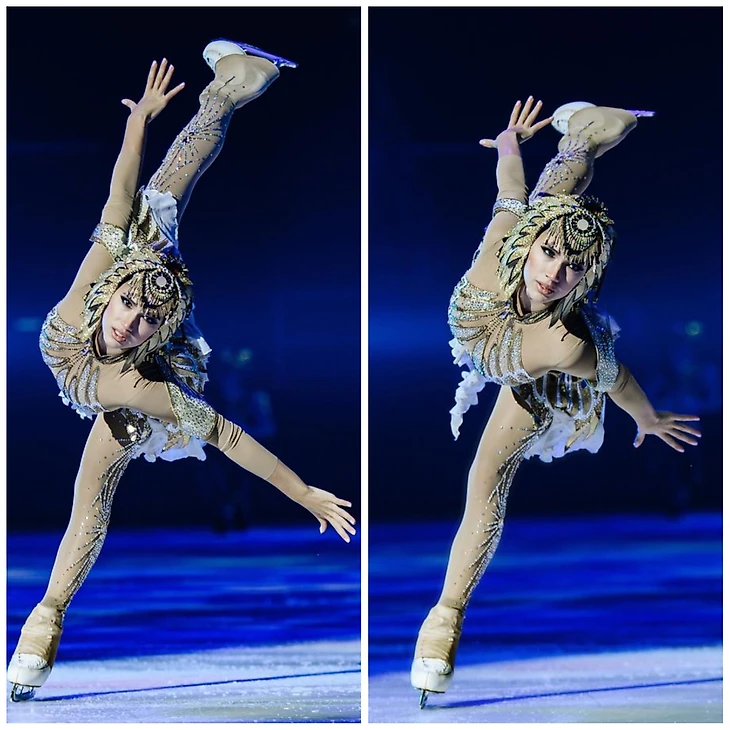 Зрители и СМИ, которые были на премьере, активно делились контентом, так что, мы смогли увидеть всё своими глазами. При просмотре видео и фото невозможно не заметить, какая радостная была Алина, как отдавалась каждой роли. Две роли, два образа. Совершенно разные, диаметрально противоположные. Богиня – надменная, таинственная, опасная. И Лея – озорная, быстрая, трогательная. А какие элементы! С удовольствием увидела, что Алина вставила в прокат роли Богини свою фирменную, хоть и немного видоизмененную, дорожку из незабываемой любимой соревновательной программы «Клеопатра», а в прокат роли Леи вернула сложное вращение в заклоне, которое не любят и не делают многие, даже действующие фигуристки. Идеально выполнены вращения «карандаш», «либела», да другие элементы фигурного катания – Алина показала, в какой она хорошей форме. Тонкая, звонкая! По льду носилась с огромной скоростью, партнёры еле поспевали, не в обиду будет сказано😉
