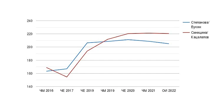 Сашу с Ваней на международной арене мы увидели после Сочинской олимпиады 2014-ого года, где Никита Кацалапов на тот момент еще с Еленой Ильиных был в призах. Дуэт Кацалапова и Ильиных распался, что стало огромным потрясением для федерации, специалистов и болельщиков. Так, Вика с Никитой встали в пару и дебютировали на серьезном международном турнире - европейском первенстве - в 16-ом году. На том старте три российских дуэта шли один за другим в турнирной таблице (3 место Боброва/Соловьев, сразу после Синицина/Кацалапов и замыкали Степанова/Букин). На протяжении пары последующих лет Саша с Ваней даже обходили по баллам своих коллег по сборной, однако поворотной точкой стал 2019 год, когда Вика с Никитой завоевали медаль мирового первенства. После этого внегласно их считали лидерами сборной, а Степановой/Букину так и не удавалось подняться на пьедестал Чемпионата Мира.