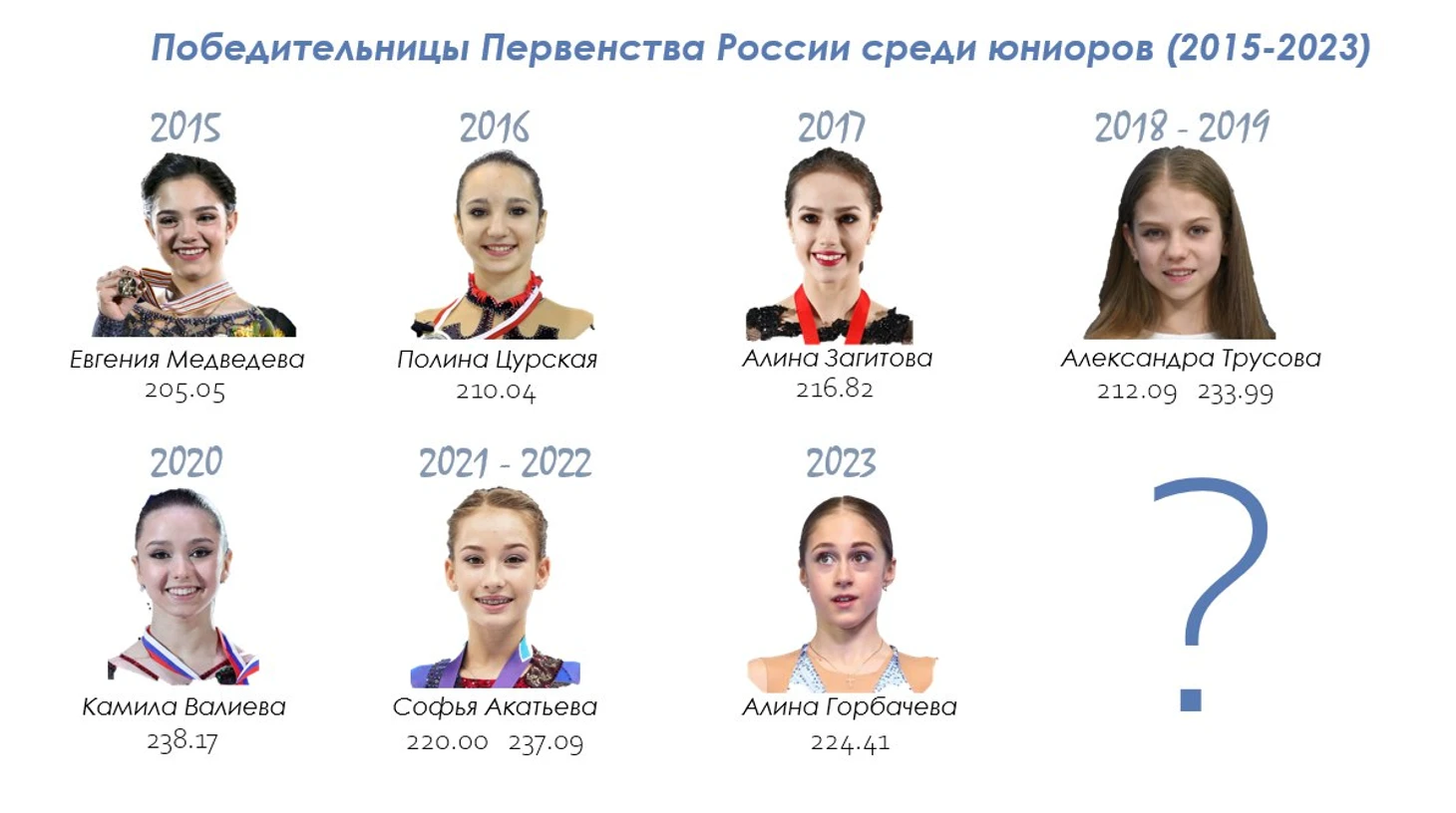 Большой вопрос - будет ли Вероника Жилина участвовать лишь во взрослых стартах или все-таки тренеры ее заявят на юниорское первенство. Во взрослых ее ждет соперничество с трио Хрустального, которое вряд ли позволит ей забраться на пьедестал Чемпионата России. По юниорам у Ники хорошие шансы завоевать медали, но все-таки на золото юниорского национального чемпионата главной претенденткой остается Маргарита Базылюк: все при ней - стабильность, музыкальность и внушительный прыжковый контент. А серебряную и бронзовую медали будут между собой делить Алиса Двоеглазова и Алена Принева)
