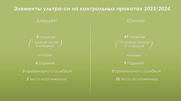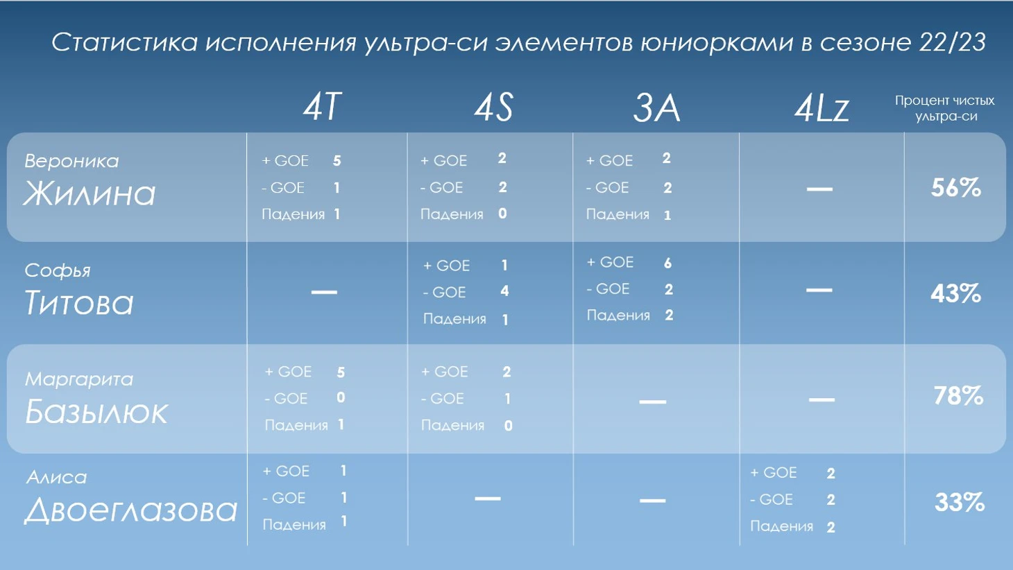 В прошлом сезоне из участниц прокатов элементы ультра-си исполняли 6 фигуристок, среди которых Маргарита Базылюк (4S,4T), Софья Титова (3А,4S), Вероника Жилина (3А,4S,4T), Алена Принева (4Lz), Мария Гордеева (4Т,4S) и Алиса Двоеглазова (4Т,4Lz).