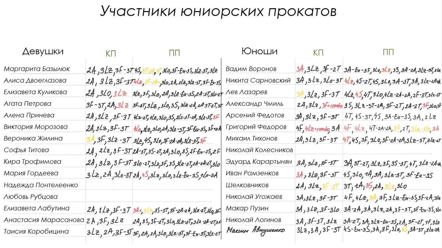 Также четверные элементы в прошедшем сезоне представляли Алина Горбачева (4S) и Дарья Садкова (4Т). Алина получила травму при изучении тройного акселя и не смогла откатать свои программы на прокатах, так как еще не закончился период восстановления. А Даша, по информации СМИ, будет принимать участие в сентябрьских прокатах взрослой сборной. Странно получается, что Садкову пригласили на взрослые ОП, а Жилину (которая стала второй на первенстве и выиграла Кубок Федерации) позвали лишь на юниорские.