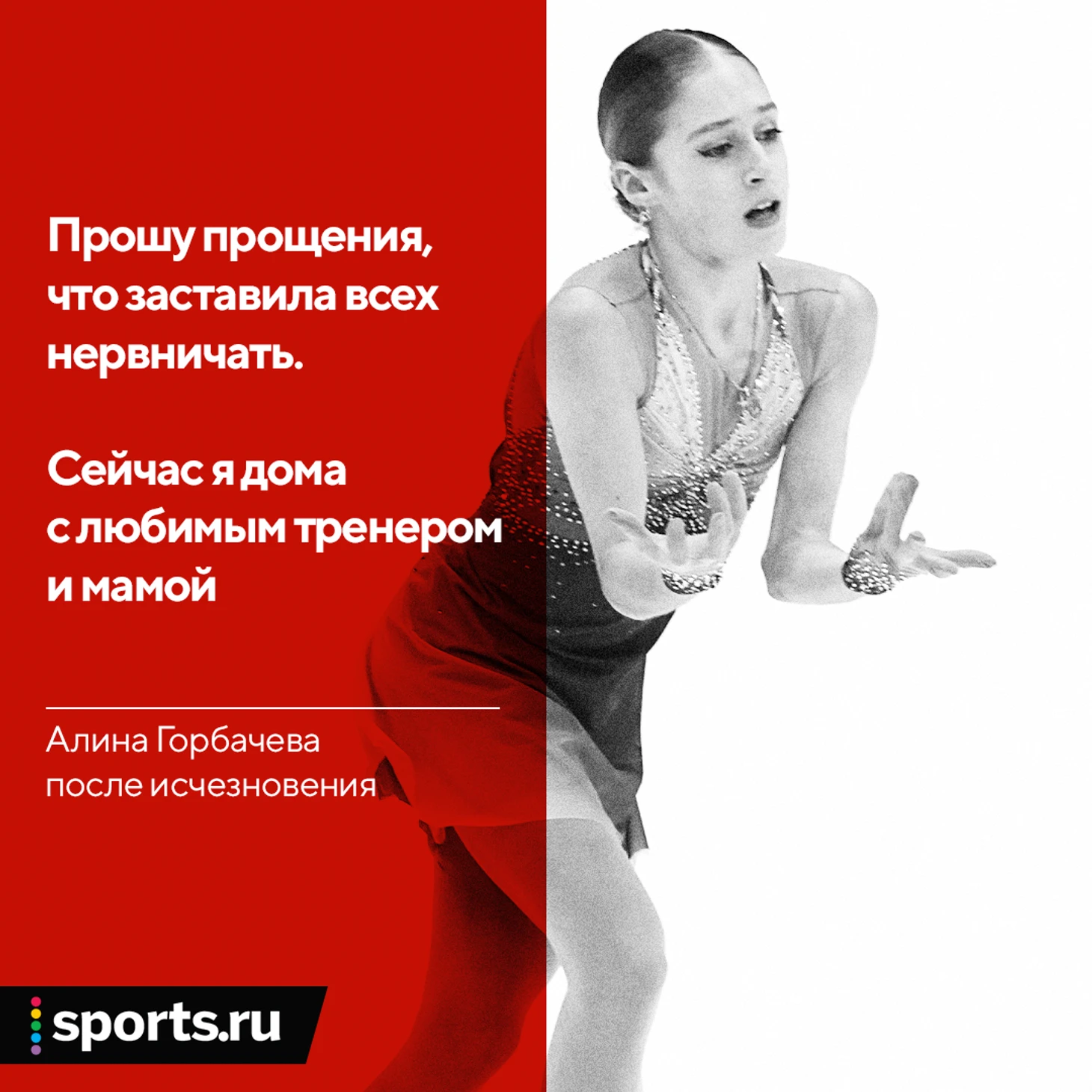 «Прошу прощения, что заставила всех нервничать и переживать за меня. Сейчас все в порядке, я дома с любимым тренером и мамой. Не волнуйтесь, мой поступок никак не связан с фигурным катанием и с Софьей Анатольевной, я буду тренироваться в своей команде и радовать вас новыми выступлениями! У нас все хорошо, не верьте СМИ и горе-блогерам».