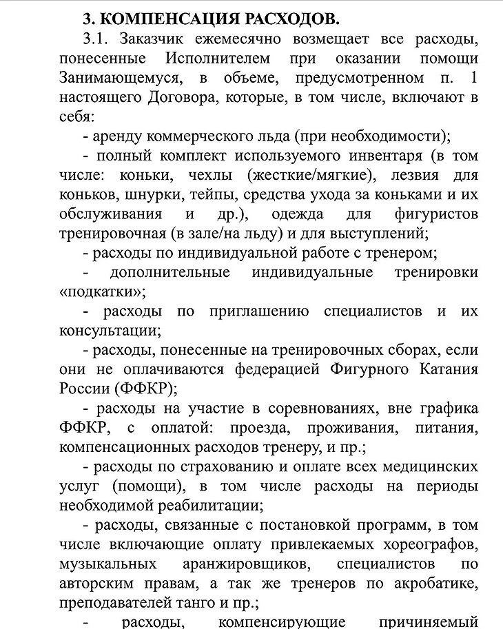 Отрицает мать Валерия и то, что он планировал покупать шнурки за счет партнерши. «Все указанные в договоре финансовые аспекты носили условный характер, так как изначально они были покрыты финансированием федерации», – пишет Светлана, игнорируя то, что по контракту Кагановские и должны были взять на себя те затраты, которые не компенсировались бюджетом.