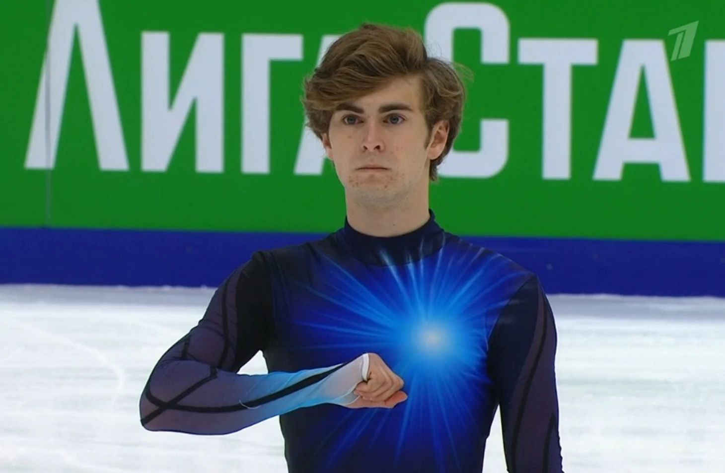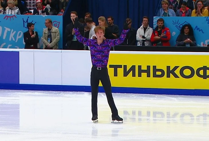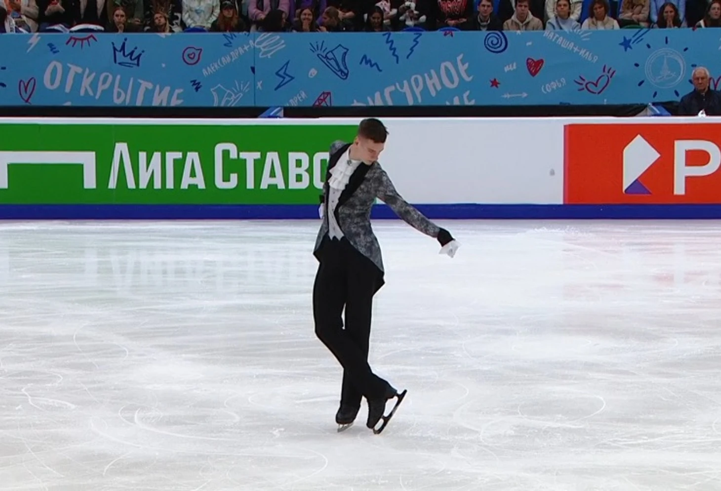 Матвей Ветлугин упал с четверного риттбергера, а вот тройной аксель удался. Сам Матвей явно расстроен: «Не получилось сегодня». Зато спародировал Загитову и Алексея Мишина – самое время вспомнить его легендарный прокат на турнире шоу-программ.