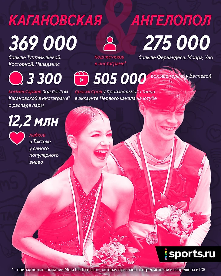 Сразу после распада Кагановской и Ангелопола тикток заполнился нарезками их прокатов под грустную музыку и переводами последних интервью на английский. Видео с подписью «почему я переживаю из-за двух иностранцев, выступающих в спорте, который я даже не смотрю» набирали сотни тысяч лайков, а комментарии выглядели так, будто распался, по меньшей мере, брак Райана Гослинга и Евы Мендес, а не спортивный дуэт.