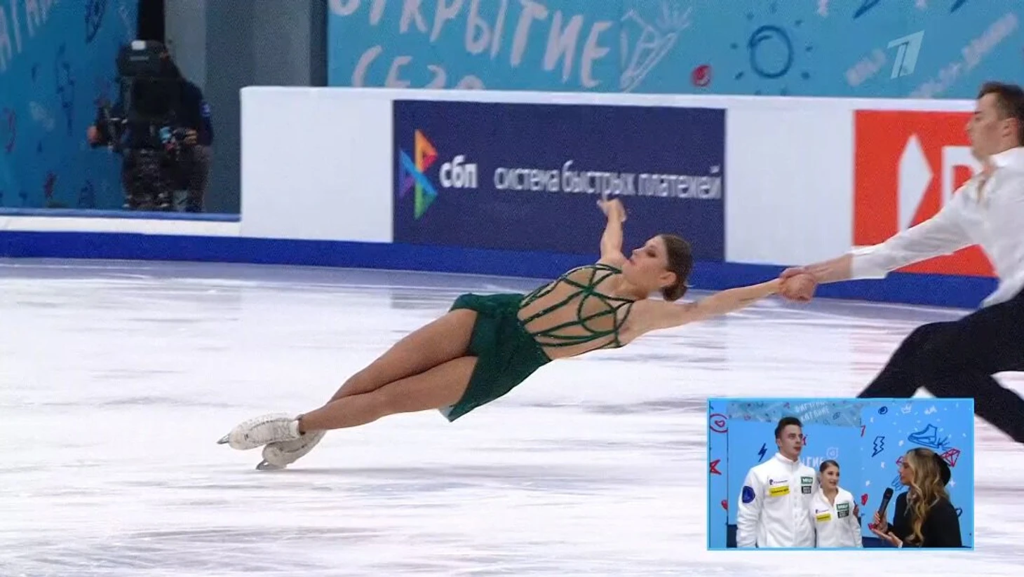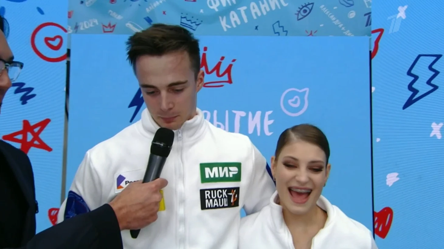 После проката ребята пообщались с ведущими Алиной Загитовой и Максимом Траньковым и ответили на важные вопросы: как тренироваться и жить вместе, под какой фамилией будут выступать и как Алена нашла партнера?