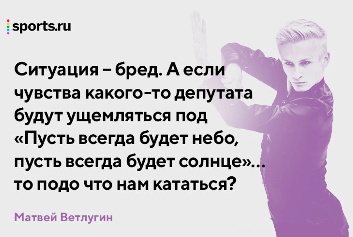 И если чувства какого-то депутата [будут] ущемляться под «Пусть всегда будет небо, пусть всегда будет солнце»… то подо что нам кататься? Я считаю, что должен был что-то по этому поводу произнести. Я хочу, если со мной произойдет такая ситуация, чтобы мне тоже помогли».