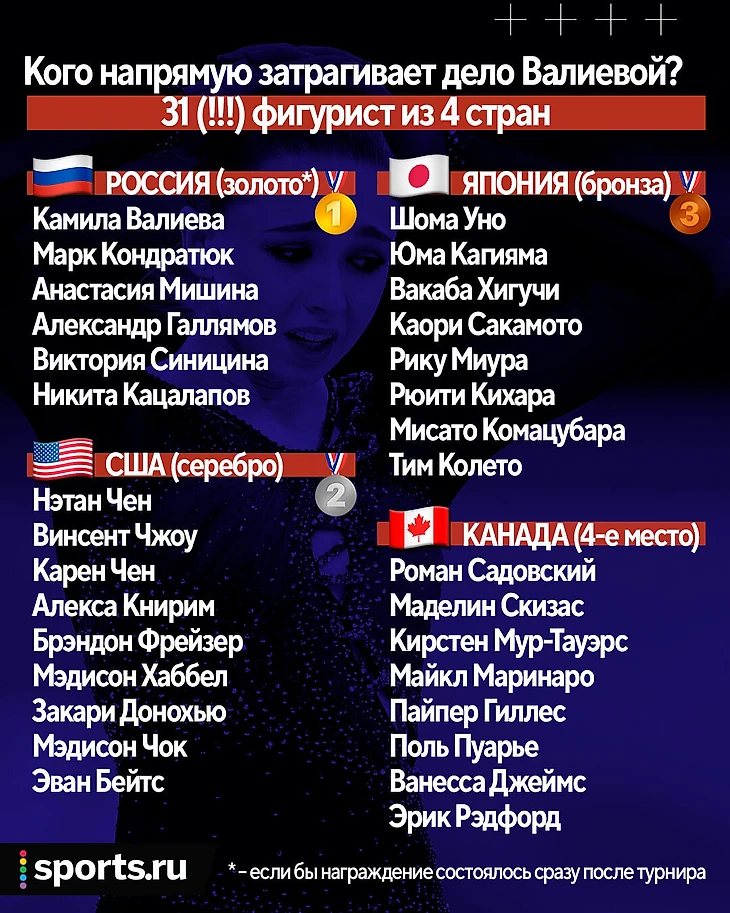 Впечатляет еще и количество спортсменов, которых потенциально затронет решение CAS: 31 фигурист (включая саму Камилу). Кто-то из них может стать двукратным олимпийским чемпионом, кто-то взять первую в карьере большую награду, кто-то, наоборот, утратит последний шанс на нее.
