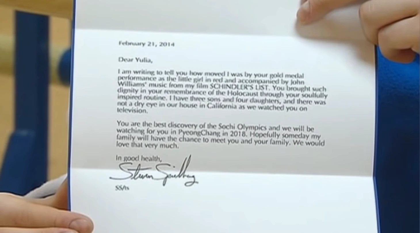 «Дорогая Юлия. Я пишу Вам, чтобы сказать, как меня тронуло Ваше победное выступление в роли девочки в красном под музыку Джона Уильямса из моего фильма «Список Шиндлера». Своей одухотворённой программой Вы оказали такую честь в память о Холокосте. У меня три сына и четыре дочери, и в нашем доме в Калифорнии не было ни одного сухого глаза, когда мы смотрели Вас по телевизору.