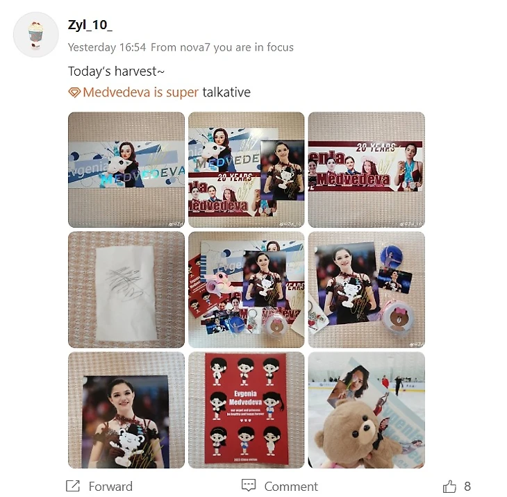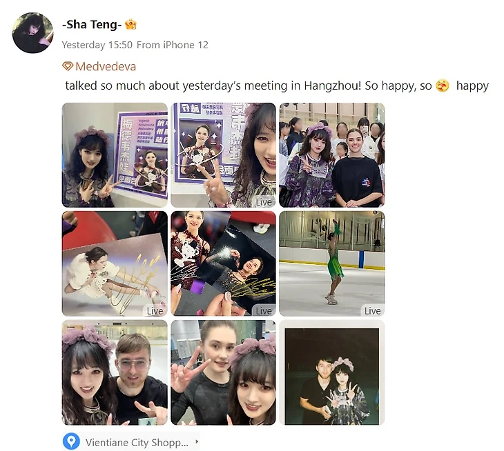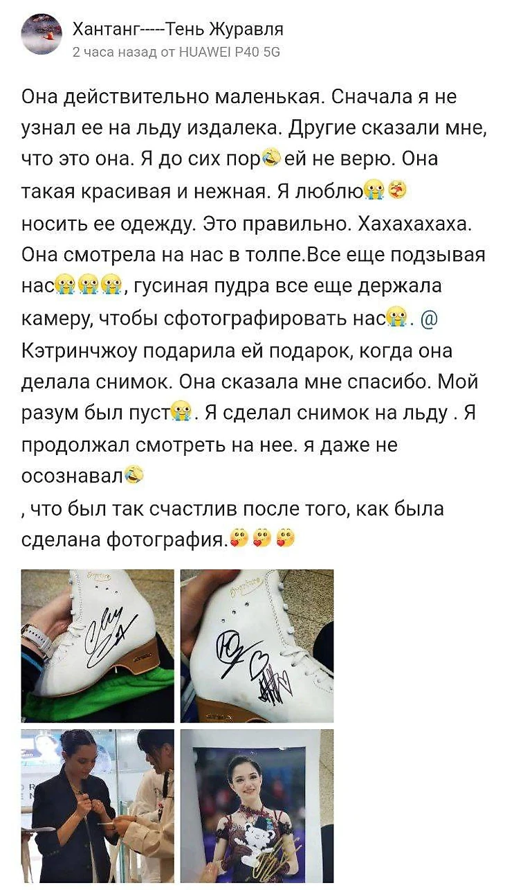 Сначала наши фигуристы показывали элементы вместе с китайскими детьми-фигуристами, там были и Настя Гулякова, и Юрий Сагутдинов. Потом было три выступления китайских детей разных возрастных групп, далее выступала Настя Гулякова под Гагарину и Женя со своей программой. Очень легко скользила, такая хрупкая, тоненькая, каждое движение попадает в музыку и в сердце. Костюм какой красивый! Изумрудный очень идет Жене. Никто не ожидал, что она будет на этом катке прыгать тройной, а она прыгнула! И далее – процесс фотографирования. Мы выстроились в ряд, она переоделась, вышла на каток, сказали заходить по 4-5 человек. За то время, пока ждали в очереди, разговаривали. Девушки начали меня спрашивать, как сказать по-русски «Я тебя люблю», мы с ними отрепетировали, потом записали видео для вас. Оказалось, многие приехали из других городов, некоторые даже с юга Китая. Спустя какое-то время решили съемку перенести на второй этаж здания, так как на катке было холодно. И вот очередь опять выстроилась. Это был небольшой уютный зал, где кто-то еще стоял в очереди, ожидая фото с Женей, кто-то, счастливый от автографа, уже ходил по залу и знакомился с другими. В итоге мы создали группу болельщиков Жени в WeChat. Там у многих на аватарках Женя. А еще у них куча стикеров с Женей! Женя была очень милой со всеми, очень красивой. Хотя встреча должна была быть до 8 вечера, закончили позднее, так как фанаты не отпускали.