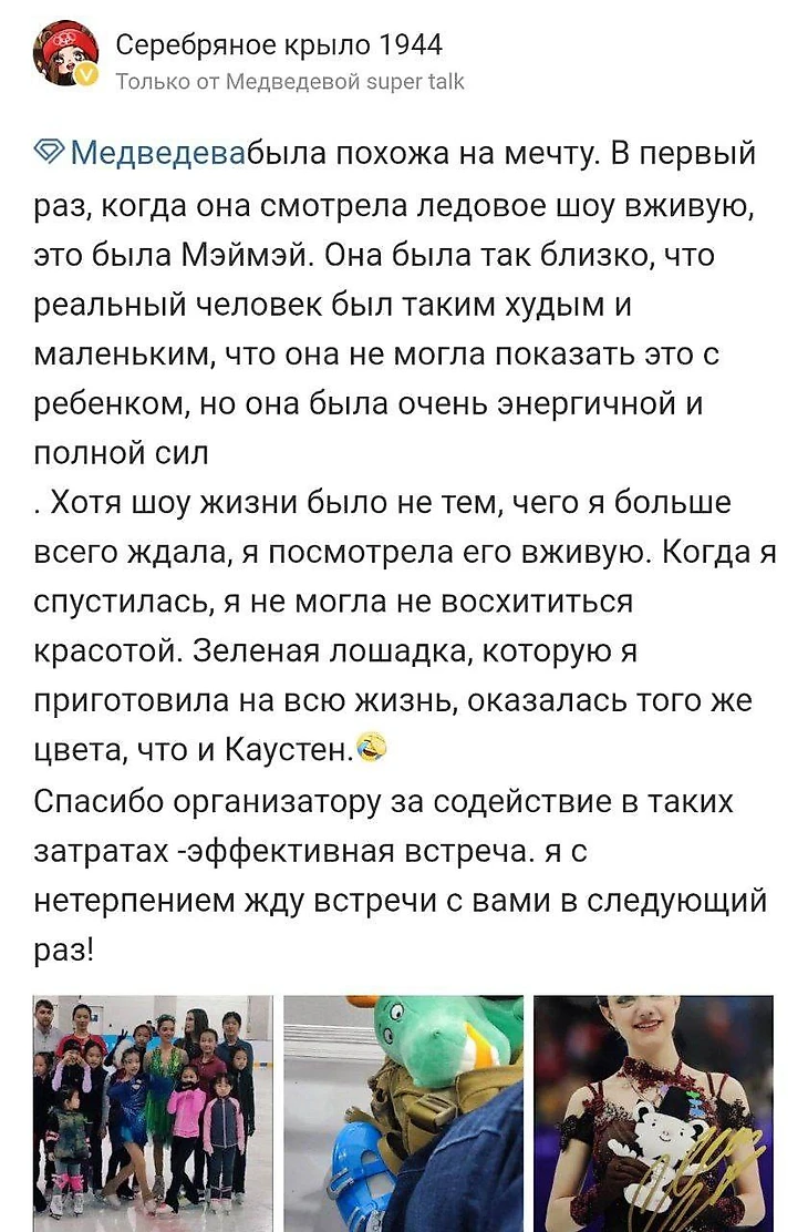 И еще хочу добавить: для многих болельщиков формат мастер-класса оказался намного лучше, чем шоу. Во-первых, шоу было на конькобежной арене, я купила билет за 12 тыс. рублей, но меня от фигуристов отделяла большая полоса льда, дорожки, и еще этажа два. Раньше до коронавирусной эпохи за такие деньги можно было сидеть в первых рядах. Организаторы также сделали VIP-места тыс. за 35 в самом центре, но даже они не гарантировали такого близкого общения со спортсменами. Например, та девочка с мамой из Шанхая. Они заплатили в общей сложности около 70 тыс. за билеты, но девочке так и не удалось ни с кем в тот день сфотографироваться, охрана после шоу не разрешала. Хорошо, что она приехала в аэропорт встречать Женю. А на мастер-классе можно было просто вблизи всех увидеть, подойти, поговорить, даже надеть коньки и самим прокатиться. Такая ламповая атмосфера, как говорится.