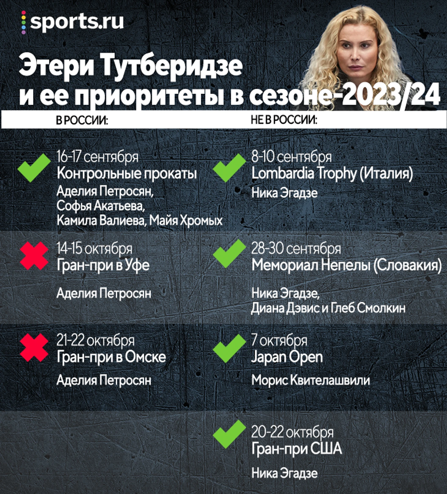 Две поездки на соревнования Эгадзе – в Италию и в США, одна поездка на шоу-турнир Квителашвили – в Японию, одна поездка в Словакию, где удалось собрать сразу и Дэвис со Смолкиным, и Эгадзе. Ноль поездок на соревнования в России, пока только присутствие на контрольных прокатах.