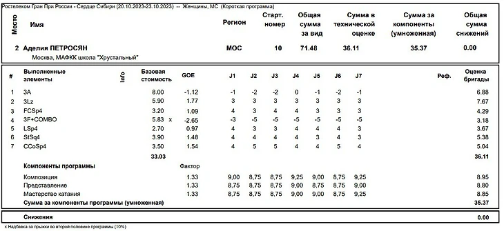 Татьяна Рашевская поставила фигуристке две 9,25 и одну девятку за компоненты, хотя Петросян дважды упала на прыжках и сделала степ-аут. А Святослав Бабенко и вовсе поставил +3 по шкале GOE за каскад со степ-аутом, за который максимум по правилам можно получить -3.
