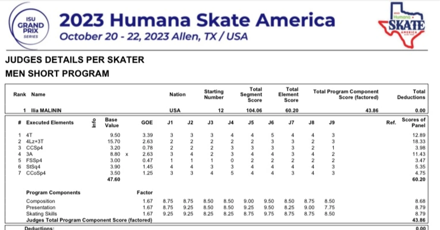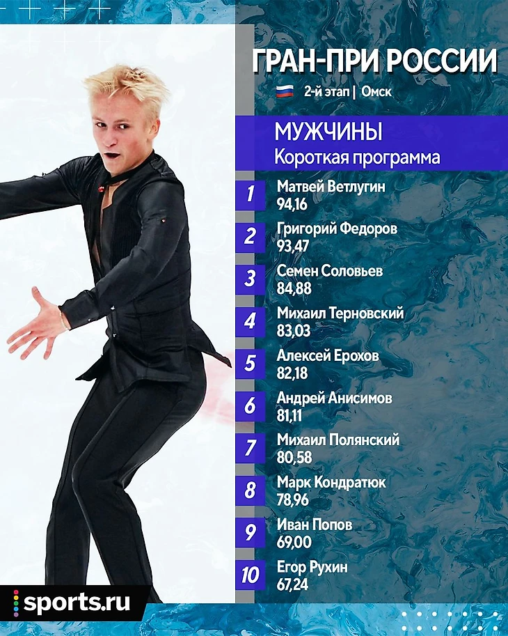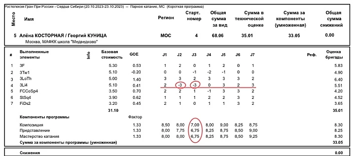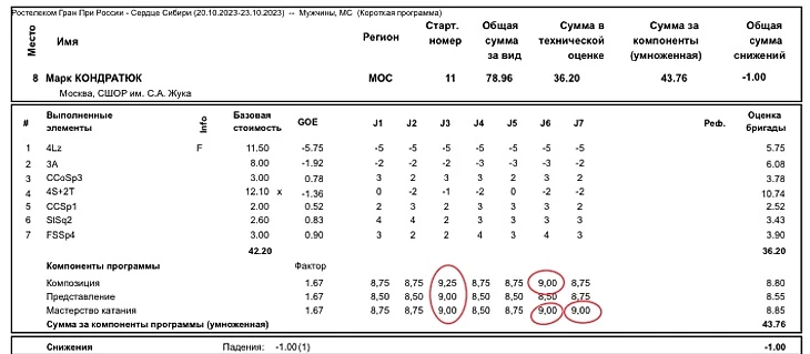 И на этом моменте дело снова доходит до темы судейства и уже так полюбившихся публике конфликтов на тему оценок за компоненты. В правилах прописано, что за 2 или более грубые ошибки спортсмен не может получить за компоненты оценку, превышающую 8.75, - у Марка с двумя грязными элементами и падением таких целых 6! Забавно, что по второй оценке Марк второй, уступив лишь Матвею Ветлугину, который выиграл короткую программу, прекрасно исполнив 4Т и 3А, немного «отпустив» каскад - так оценки могли бы быть под 100))) Григория Федорова можно поздравить с двумя чистыми четверными и пожелать удачи в произвольной программе!