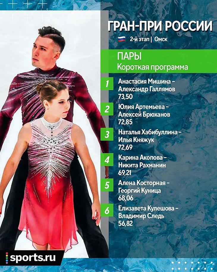 Чемпионы Мира и Европы Анастасия Мишина/Александр Галлямов остались без элемента, но все равно сохранили лидерство после короткой программы: у Насти 3S вышел чистым, а вот Саша упустил момент отталкивания и скрутил лишь 1 оборот - как итог 73,5 балла. Что хотелось бы отметить: очень зацепила их новая постановка и чудесные костюмы; совместная работа партнеров поражает - каждое движение выверено и вторит музыкальным акцентам. Эх, если бы сальхов не подвел, баллы бы были выше 80-и.