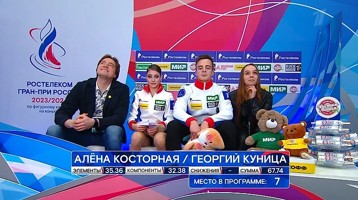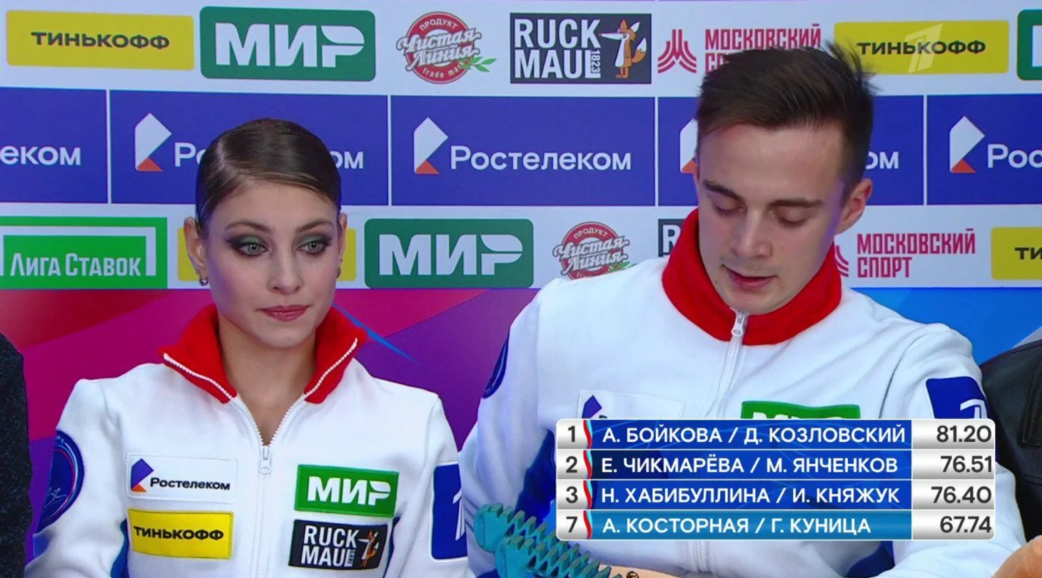 А в Москве Косторную и Куницу обогнали почти все. Это касается и техники, и компонентов – обе оценки соответствуют их 7-му месту. Например, только у них подкрут второго уровня: не хватило высоты, на приземлении Алена подставила вторую ногу, чтобы удержаться.