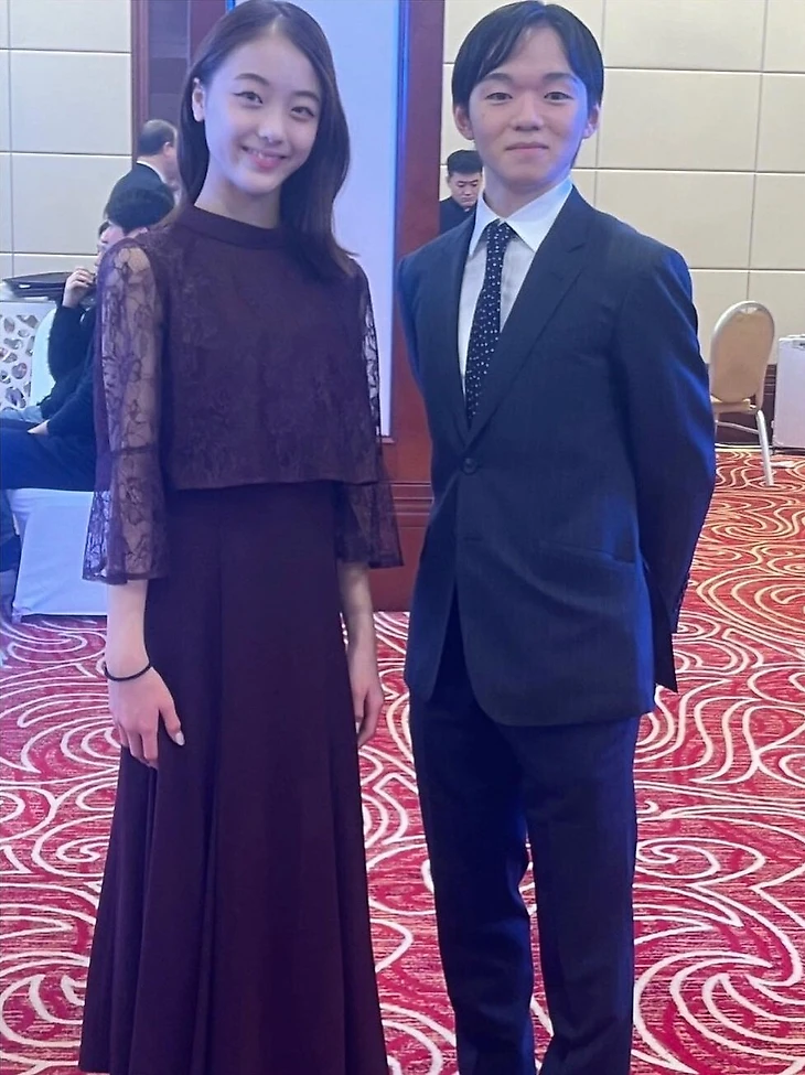 А вот Юма Кагияма при параде – даже с галстуком в мелкий горох. Рядом – бронзовый призер соревнований у девушек Рена Уэзоно.