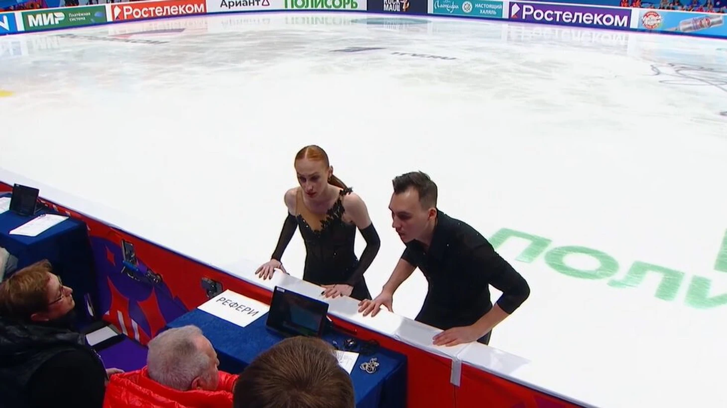 Они сделали первый прыжок, Лиза даже успела прыгнуть второй. А вот Артем тут же остановился и поднял руку, обращаясь к судьям. Что-то не так.