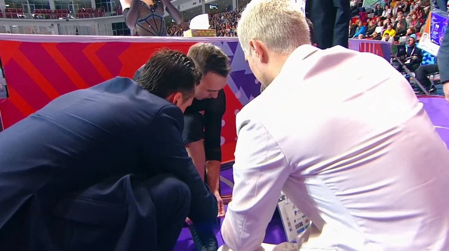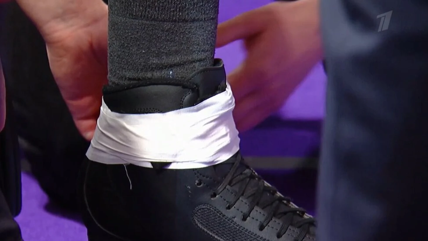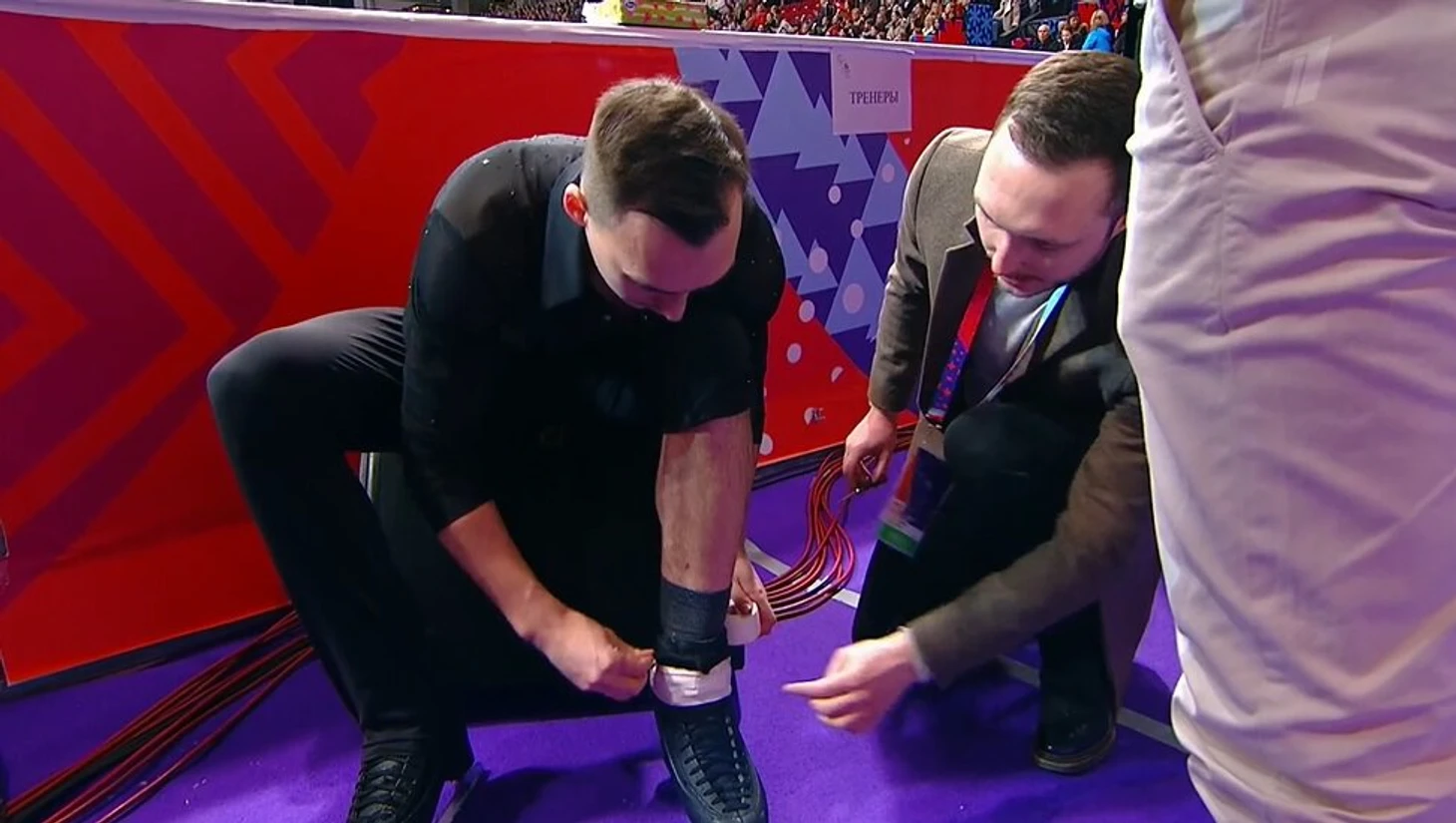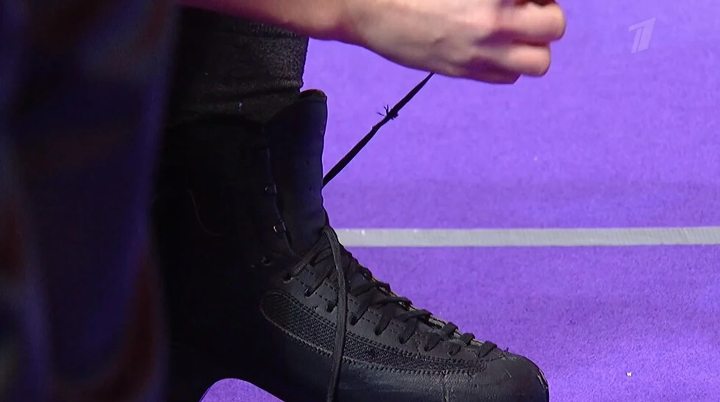 Договорившись с жюри, Грицаенко тут же выскочил за пределы льда. Оказалось, проблемы с левым ботинком. Лопнул шнурок.