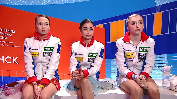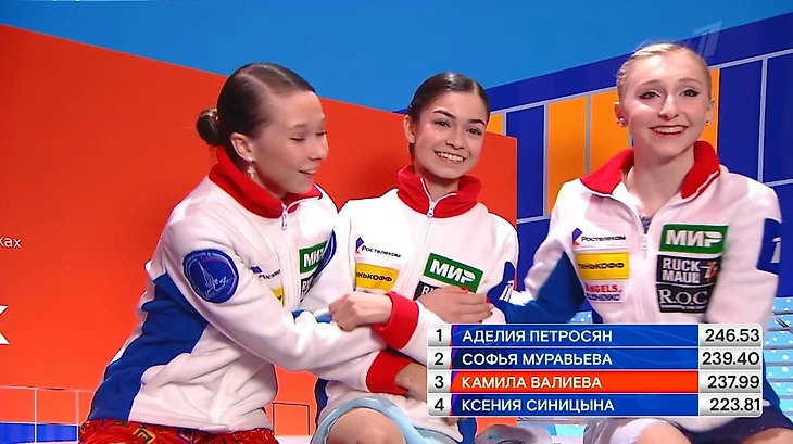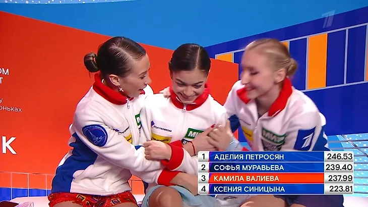 Петросян выступала до Валиевой, так что интрига держалась до последнего. Вот она вместе с Софьей Муравьевой и Ксенией Синициной напряженно всматривается в экран, где должны появиться оценки Камилы: