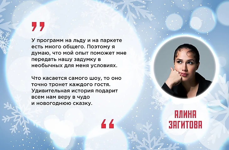 « Алина Загитова сыграет одну из главных ролей и выступит с танцевальным номером. Легендарная фигуристка отмечает, что у танца и ледового проката много общего, а шоу точно тронет каждого гостя. А вы ждёте встречи с Алиной?» https://vk.com/extreme_elka?w=wall-223718869_73