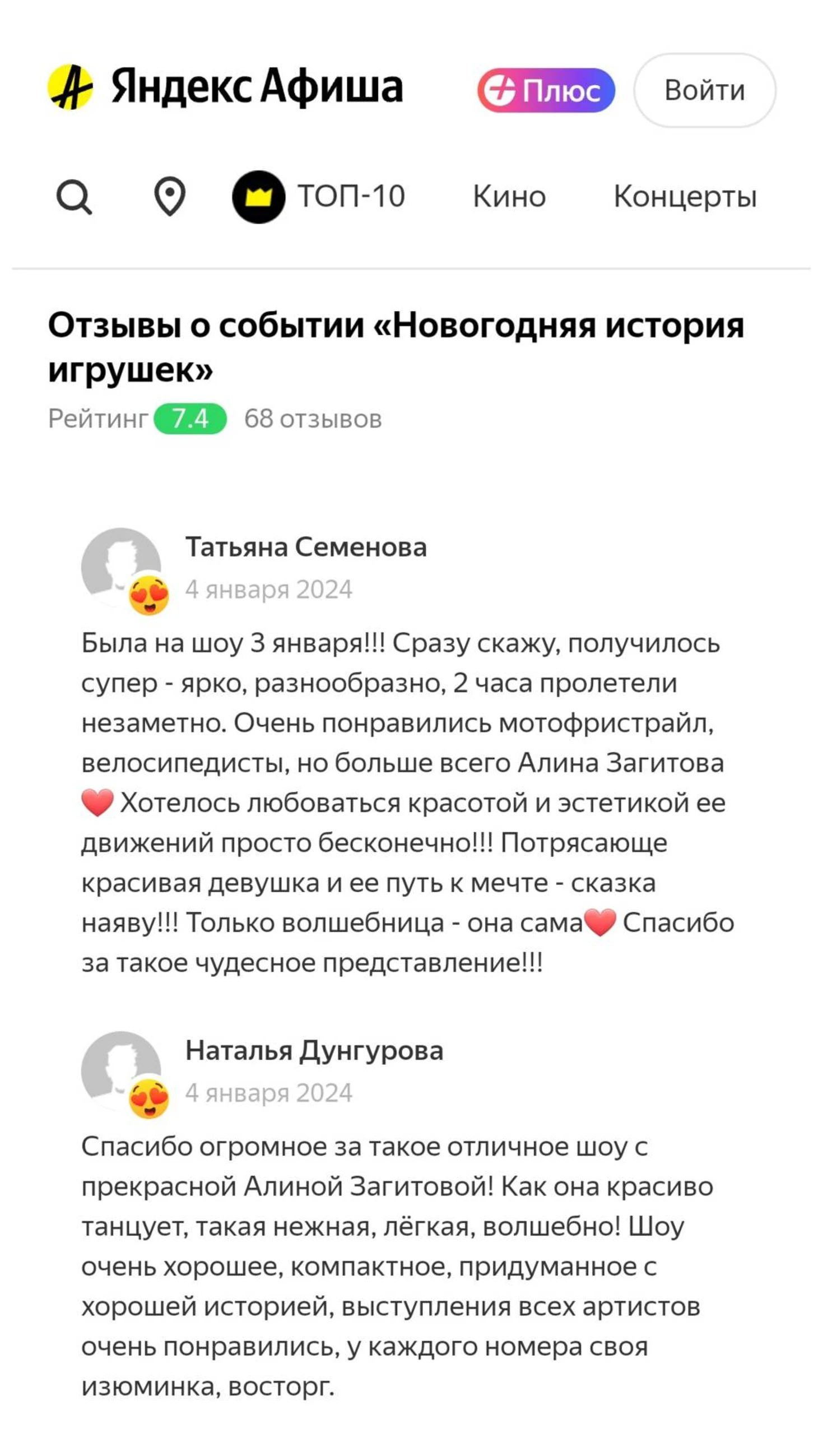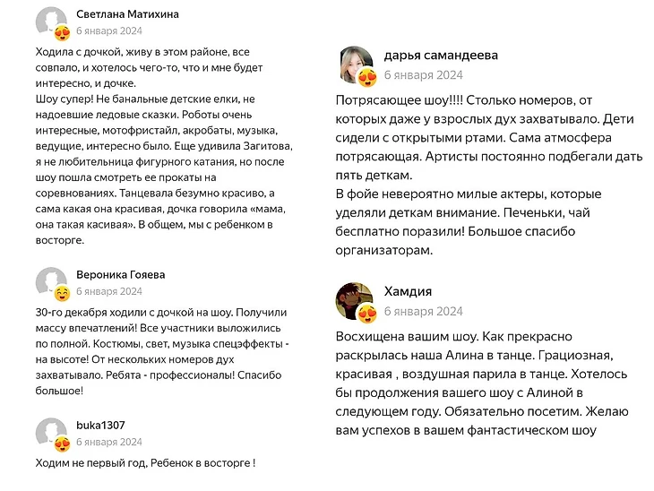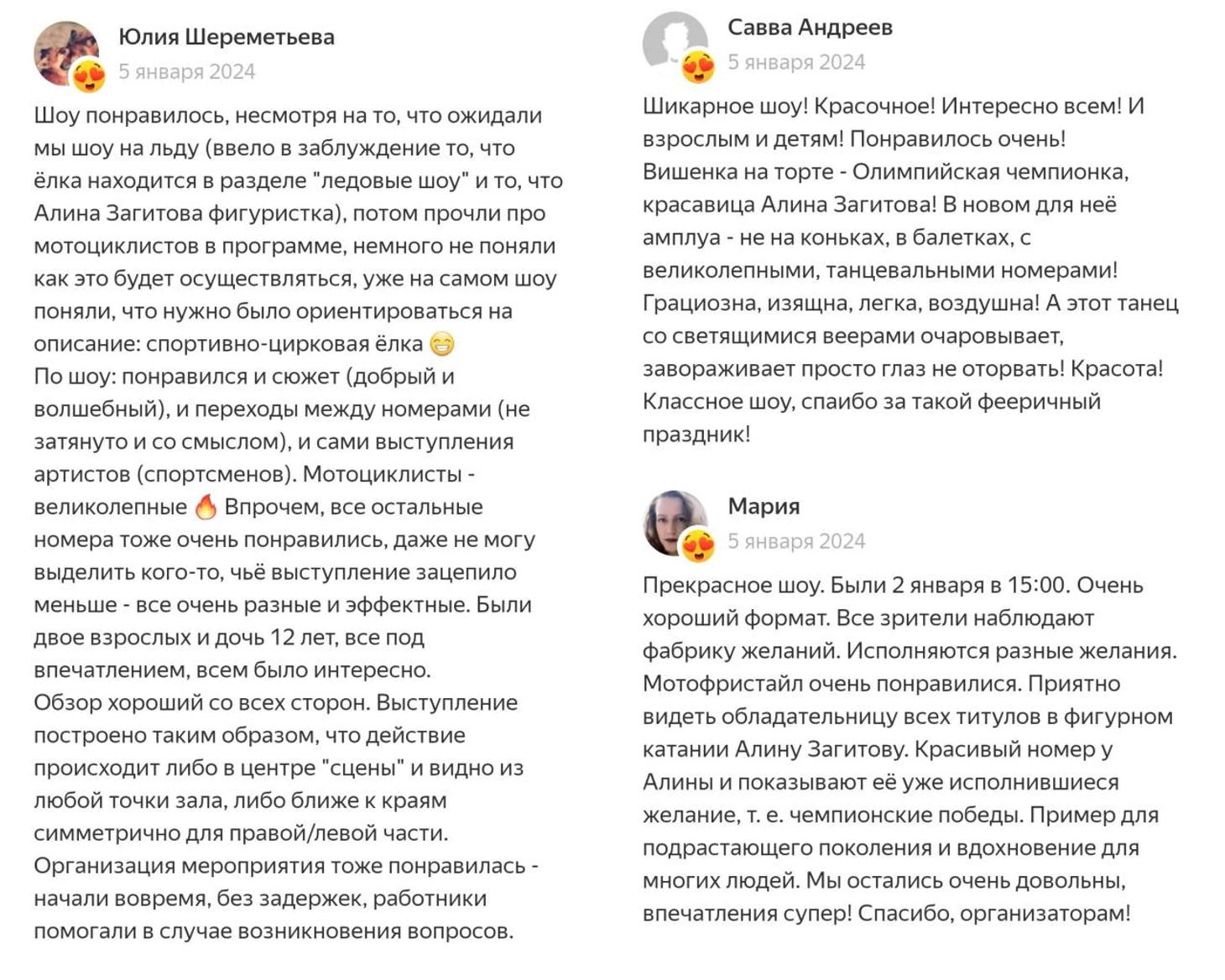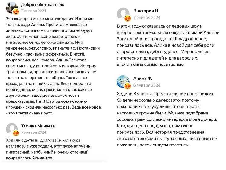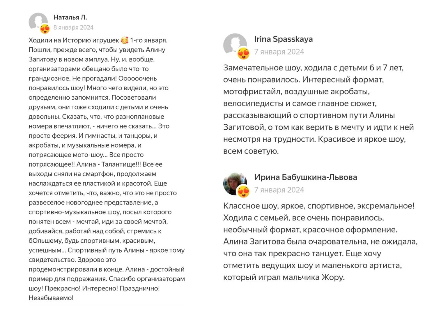 Алина Загитова вместе с командой шоу не зря старались. Согласно отзывам зрителей, посетившим это шоу, понравилось многим. Вот часть отзывов, оставленных на сайте Яндекс-Афиши https://afisha.yandex.ru/moscow/show/novogodniaia-istoriia-igrushek-show/reviews